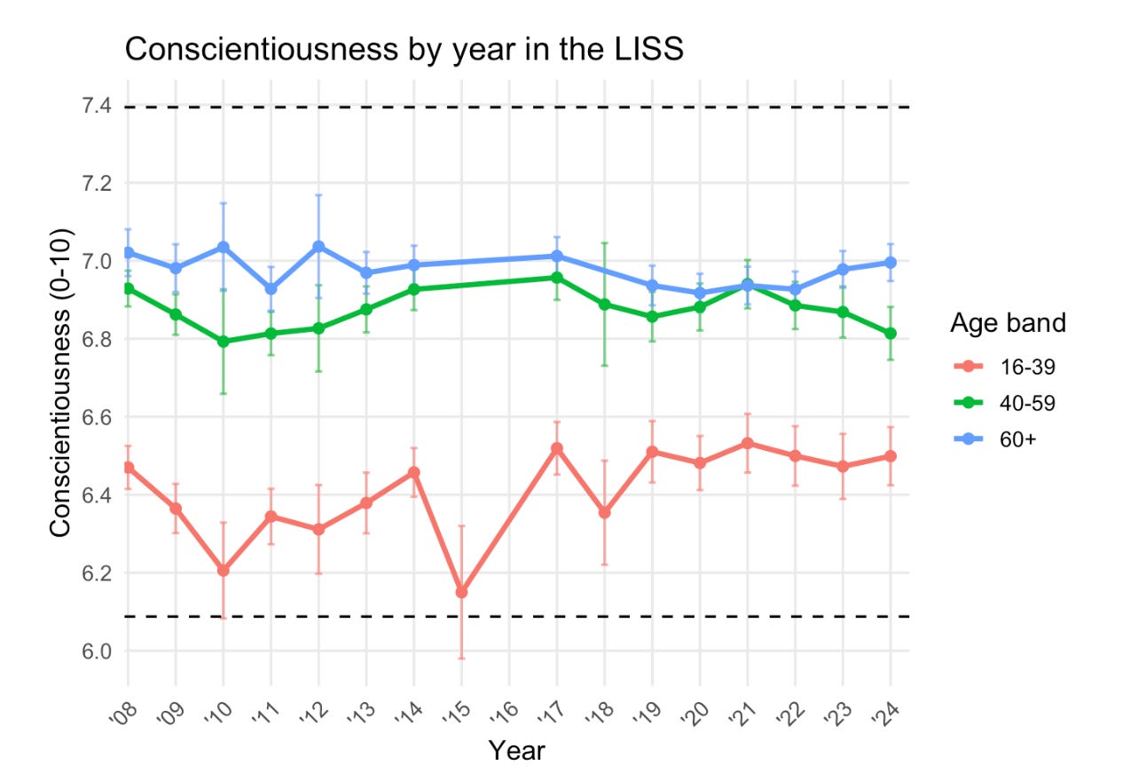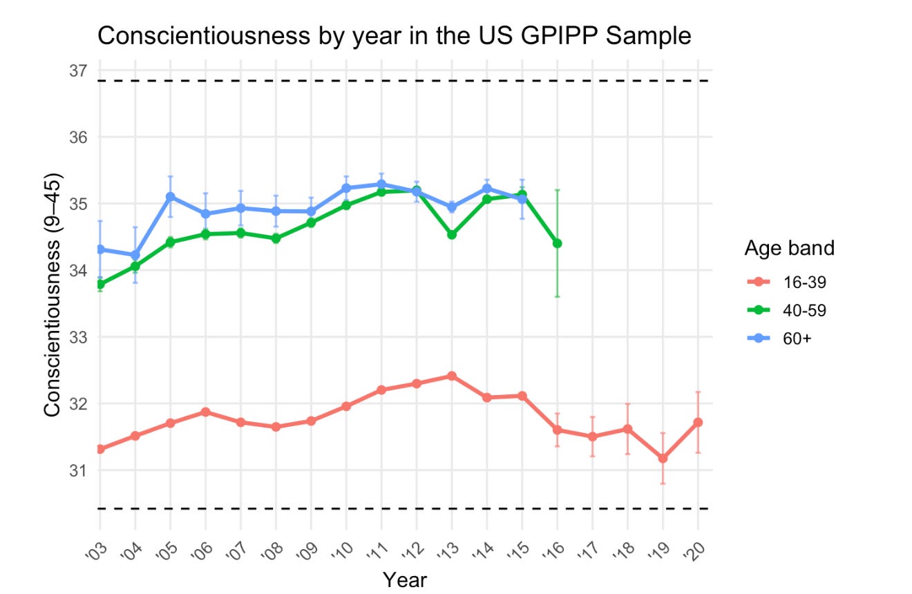 In our data where we track people over a longer period of time, do people start going down in 2014 or so? A little bit, just much smaller. But what was really cool is we have history in that data all the way back to 2000. And you see that actually, people were increasing [on conscientiousness] and that the peak year for people was 2014.